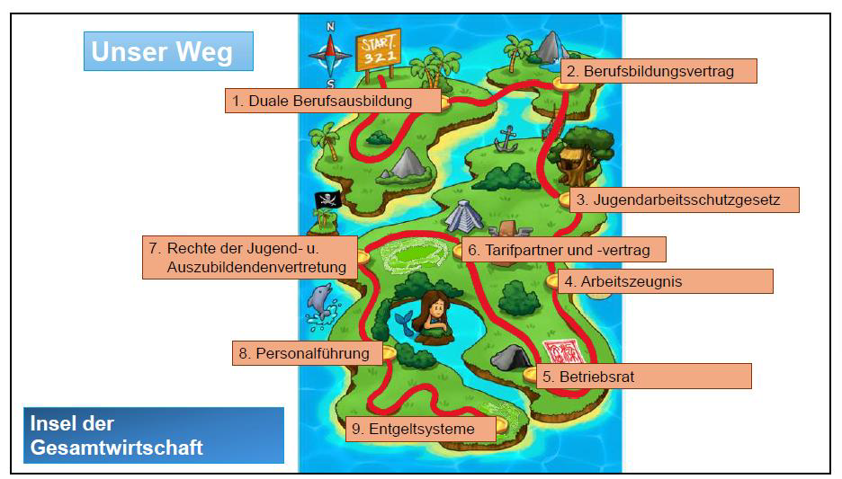 Methode detailliertZur klareren Darstellung der Gesamtheit der Unterrichtsthemen werden diese auf einer Inselkarte als Wegstationen aufgezeichnet. Lektion für Lektion entwickelt sich der Unterricht dem Lernweg entlang. Mit dem Advance Organizer können die SuS nun jederzeit nachvollziehen, wo sie auf ihrem Lernweg stehen (Abb. 1).
