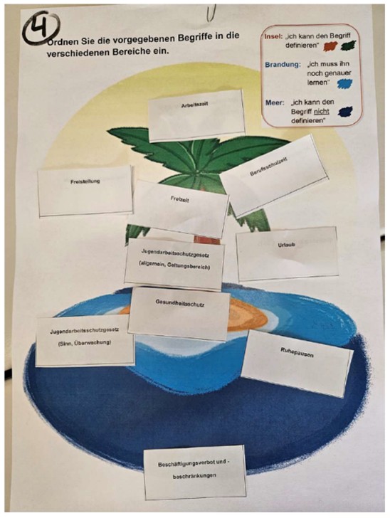 Zu den einzelnen Stationen bietet die Lehrkraft Wiederholungsabfragen zu Fachbegriffen mit der «Insel der Wiederholung» an: Die SuS erhalten pro Bankreihengruppe (2-4 SuS) eine Abbildung (Insel) und 10 Karten mit Fachbegriffen, die in der vorherigen Lektion erarbeitet wurden. Die SuS beraten sich und legen die Karten, deren Begriffe sie definieren können, auf die soliden Teile der Insel (Inselland, Palme) oder auf den sonnigen Himmel. Begriffe, die Unsicherheit auslösen, werden auf die Zone der Brandung gelegt. Begriffe, welche die SuS nicht definieren können, werden auf das tiefblaue Wasser gelegt (Abb.2). Die Lehrkraft dokumentiert diese formative Leistungsüberprüfung mit Fotos.